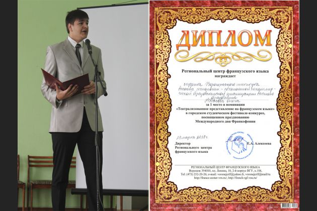 Участники фестиваля получают грамоты, призы и подарки. В празднике, посвященном празднованию международного дня Франкофонии, традиционно принимают участие и становятся лауреатами студенты Воронежского института высоких технологий, изучающие французский язык в качестве первого или второго иностранного языка. В этом году в конкурсе принимал участие и занял 1 место в номинации «Театрализованное представление на французском языке» студент направления «Информационные системы и технологии» Аббасов Олег. Наши поздравления!