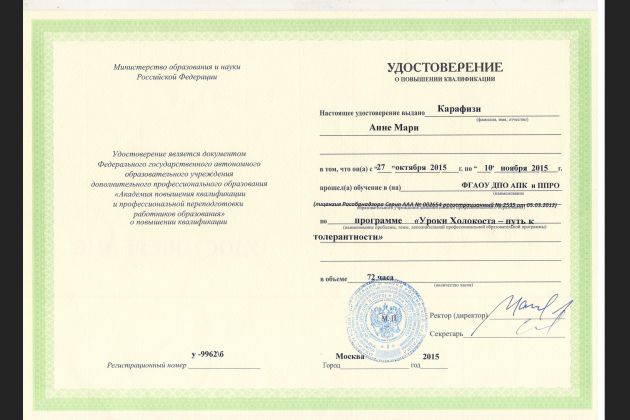 Сотрудники международного отдела ВИВТ получили удостоверения «Академии повышения квалификации и профессиональной переподготовки работников образования». А.-М. И. Карафизи – о повышении квалификации по программе «Уроки Холокоста – путь к толерантности». О.И. Кулинченко - по дополнительной профессиональной программе «Педагогика диалога культур и поликультурное образование в контексте формирования российской и цивилизационно-культурной идентичности».