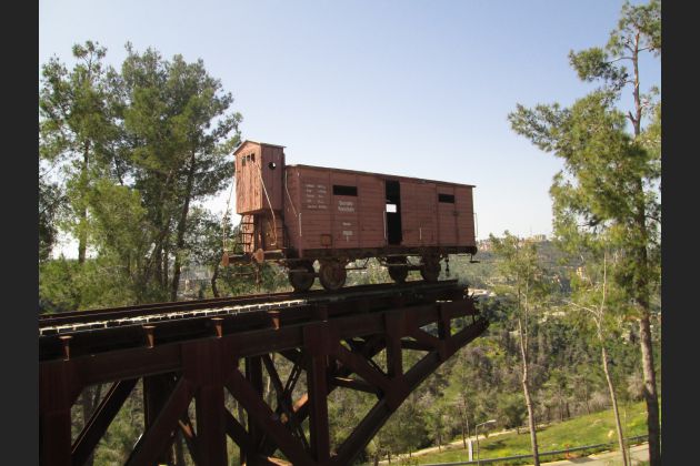 Фото 1. Памятник трагедии Холокоста. Вагон, в котором депортировали евреев.